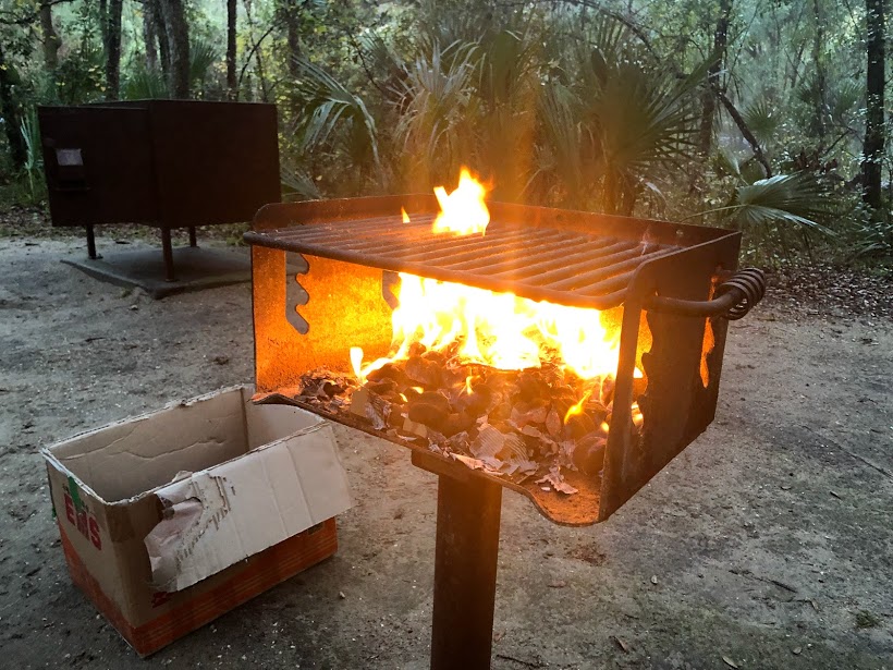 슬슬 불을 피워 보기로 합니다. 미국에는 이런 공용 그릴이 어디에나 있습니다. 캠핑장에도 있고, 그냥 동네 공원에도 있습니다. 소독용 알콜로 그릴을 닦고 저기 위에 바로 먹는 사람도 있는데 저는 도저히 그럴 엄두가 안나서 항상 따로 그릴을 사갑니다.