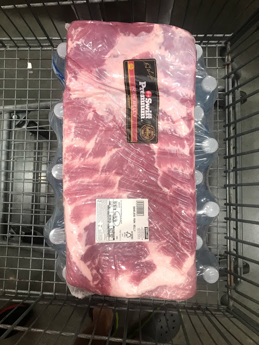 캠핑하면 삼겹살이니까, 코스트코에 들러 삼겹살을 샀습니다. 대략 4kg에 22.92 달러 입니다. 한국보다 훨씬 싸긴한데, 덩어리로만 팔아서 직접 썰어 먹어야 합니다. 살코기는 괜찮은데 지방층이랑 껍질 부분이 썰기가 고역입니다.