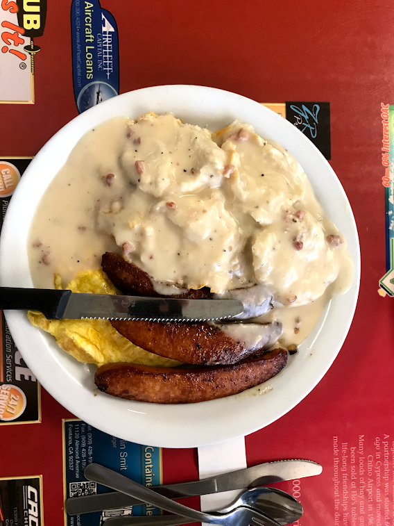 출발시간이 아침이라 모닝세트를 시켰습니다. 완전 미국식 아침식사 입니다. 약간 탄건 소시지 이고, 그 밑에 오믈렛이 있습니다. 그리고 해쉬브라운+비스킷에 그레이비 소스를 듬뿍 얹어 줍니다. 매우 짜고, 기름진 맛입니다. 한 끼 먹고나면 포만감과 느끼함에 점심도 생각 안나게 하는 맛입니다.