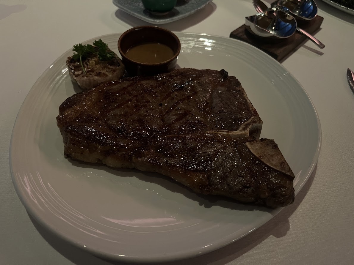 별도로 시킨 두부튀김이 올라간 샐러드와 티본 스테이크 입니다. 여기에 감자튀김과 리조또 하나까지 추가하니 팁 15% 포함 170불 나왔습니다. 두명이서 배부르게 먹고 나왔네요.